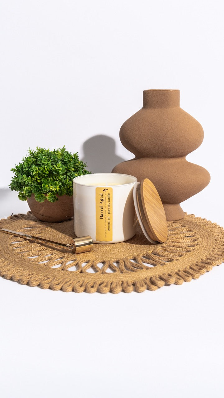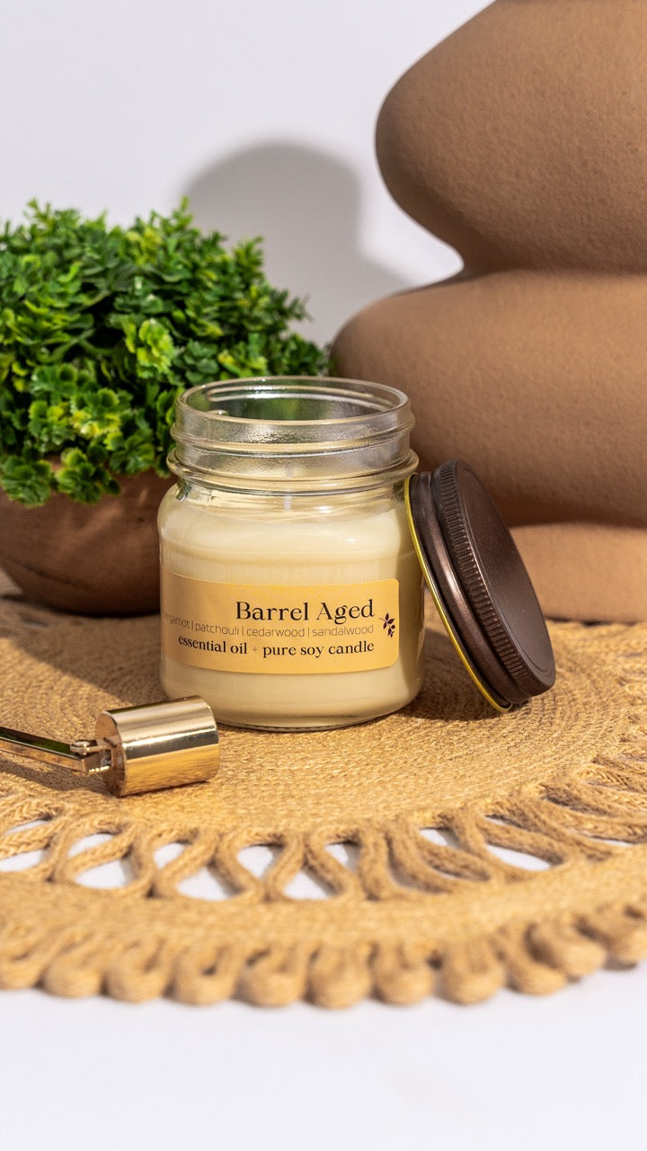 Barrel Aged is a blend of patchouli, bergamot, cedarwood, and sandalwood essential oils, creating a golden, musky aroma. Like enjoying an old scotch with a great friend in a mood-lit room.